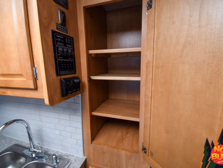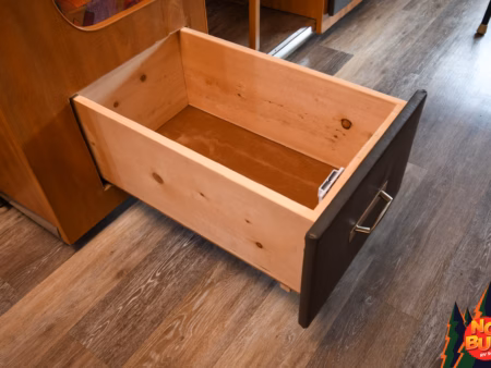 As the days wind down, Grandpa takes the kids on a quick tour of “the biggest bathroom they’ve ever seen in a motorhome.” The standing shower is roomy enough for the tallest of the bunch, and there’s still space to move around when you step out and grab a warm towel from the deep linen closet. Everything has its place—plenty of storage, a solid vanity, and just enough space to avoid crashing into anything. And with the dual entry, no one will bump into anyone else on those late night trips.