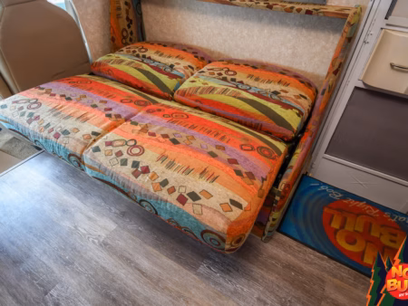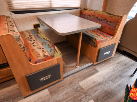 When the sky turns lavender and the last hints of sunlight fade, the family settles in for the night. Grandma and Grandpa retreat to the slide-out rear bedroom, hanging their jackets neatly in the wardrobe before slipping into the cozy queen bed. Up front, one grandchild curls up on the sofa-bed, the other climbs into the loft bunk above the cab, the best “secret fort” a kid could ask for. Outside, the prairie stretches for miles in every direction, silent and starlit. Inside, the soft hum of the night and the warmth of a shared adventure lull them all to sleep, wrapped in the simple magic of summer on the road.
