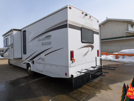 The evening sky blushes with a soft hue as the 2012 Searcher 31M Class C motorhome glistens under the falling sun. Loosening the straps around the custom-built rear storage rack, a young boy helps his grandfather who crouches, readying himself to lift off. Embers dancing around her face, a young man sets out a few chairs around the fire. Behind her is their grandmother, twisting the knobs to the exterior stereo system (not tested) her favourite tune floating around the campsite as the 4.0KW generator hums on the other side.Â