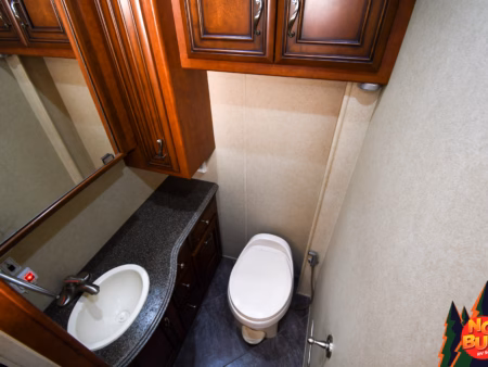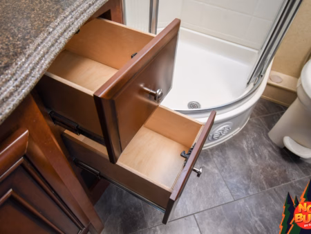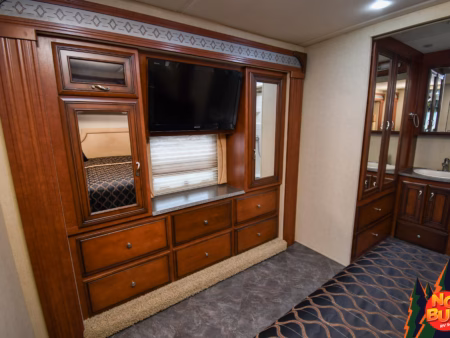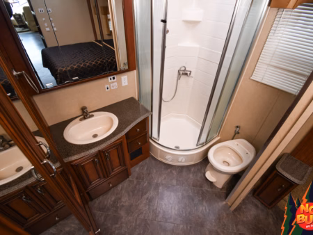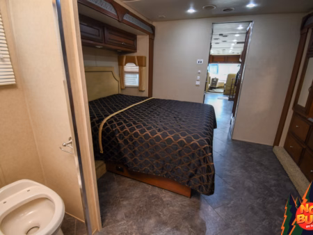 Down the narrow hall, the first bathroom waited with its large vanity and foot-flush toilet, opposite a closet that hid the washer/dryer. The rear bathroom was larger than logic, a standing shower and deep closets that seemed to breathe open. And then there was the bedroom. The king bed slid outward at night, the wardrobe across from it expanding, the TV glowing faintly blue. Each time they entered, the motorhome had changed again—and each time they left, they couldn’t wait to see what they’d find next.