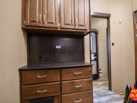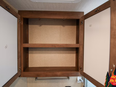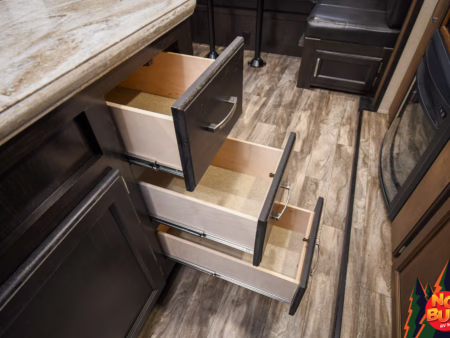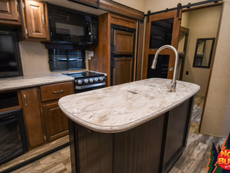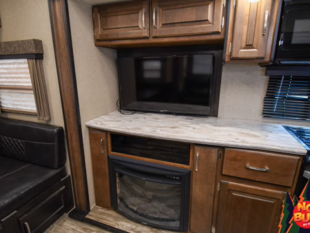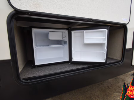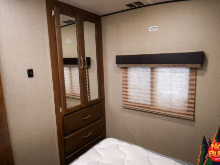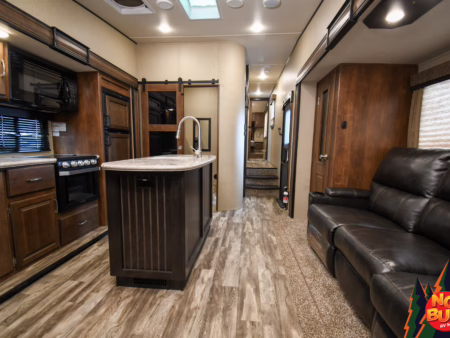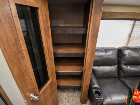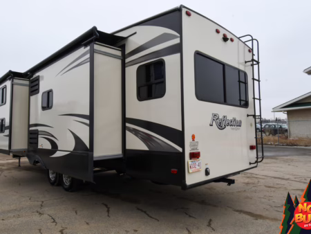 Twigs snap with his weight as he traverses the woods, trees giving way to a clearing as the golden rays penetrate the 2019 Reflection 31MB fifth wheel giving a resplendent glow. His wife—his future wife—dives into the exterior fridge for a drink before resettling in a lawn chair by the fire. Giggles from inside brings him in as he watches his children (he doesn’t have any yet) in the mid-unit bunkhouse, leaping from the bunks.