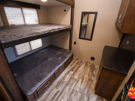 This unit comes with: Ducted A/C, power leveling jacks, tinted windows, roof ladder, queen bed, aluminum wheels, slide topper, frameless windows, solid steps, bunks, LP detectors, power awning, exterior shower