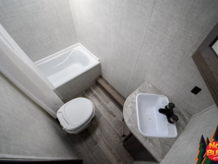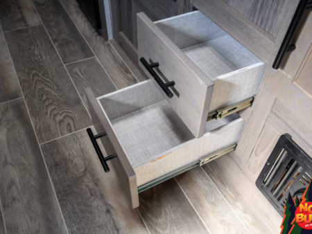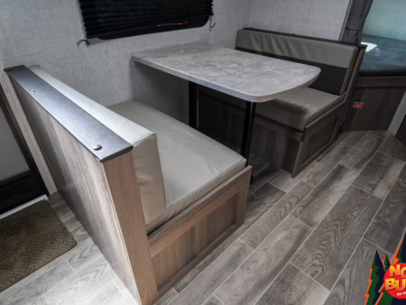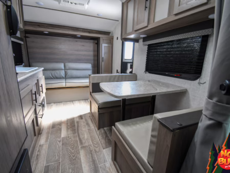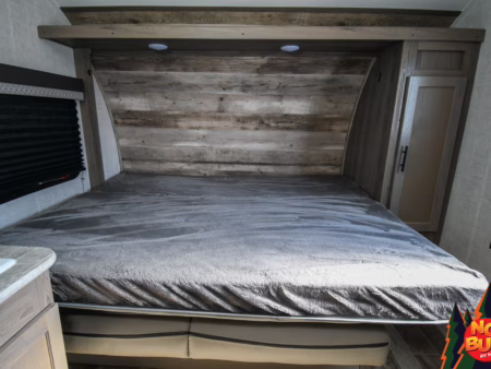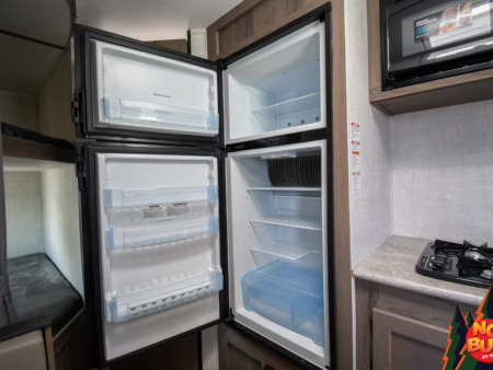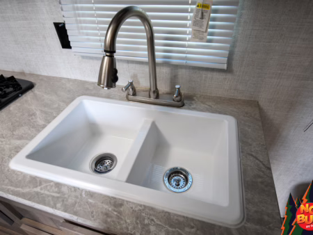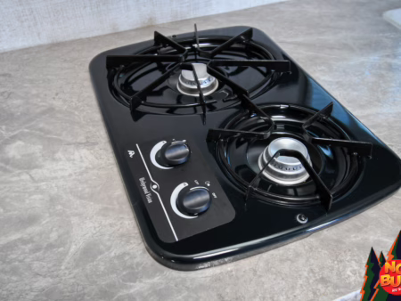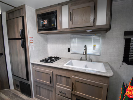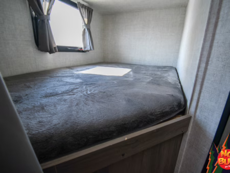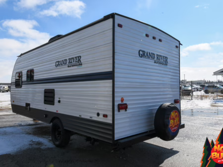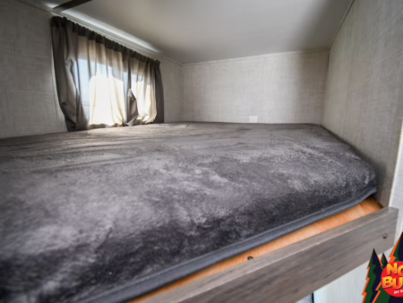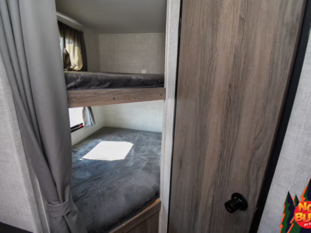 The kids were the first to wake, softly slinking out of their rear bunks and making their way to the kitchen of their 2022 Grand River 22MB. Isaac, the oldest, turns on the 2-burner stove as Marcus reaches for the bacon and eggs in the fridge. They fill the coffee maker with water from the dual sink and, with two too few scoops, brew a pot of aromatic brown-ish water that swiftly wakes their parents from their slumber in the queen murphy bed up front. “How did we get so lucky,” Mom exclaims, “to have two chefs for kids!”