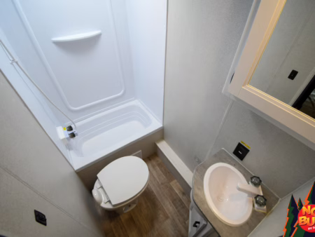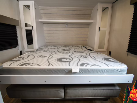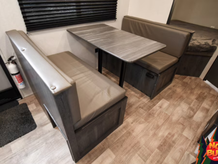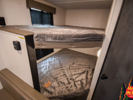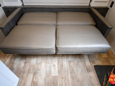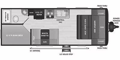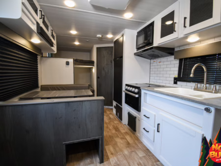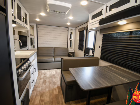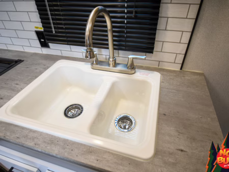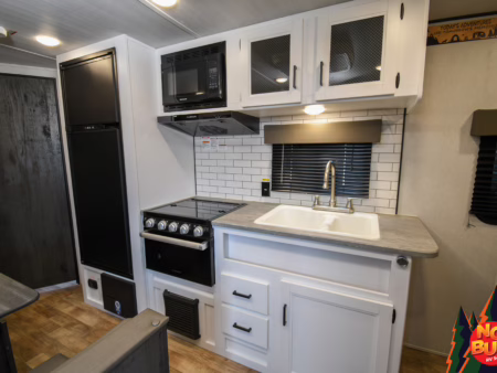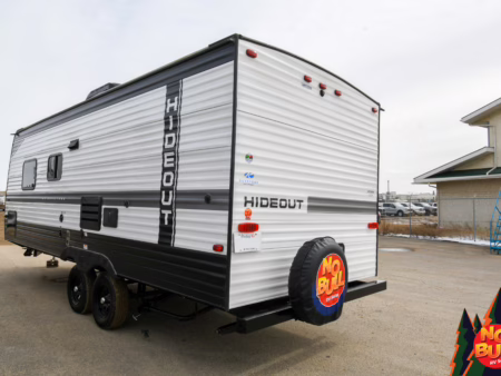 Mom wakes as the first morning light creeps through the blinds of their 2022 Hideout 21BHWE travel trailer. Soon, with the hiss of the 3-burner stove and aroma of sausages plucked from the fridge, the kids in the rear bunks tumble awake—one bursting with chatter, the other quiet and hesitant. But as they each took turns getting ready in the shower and in front of the vanity in the rear bathroom, those hungry tummies brought laughter in the warm quarters. It isn’t until Mom reaches deep into the pantry for coffee that Dad, like always, is the last to rise, throwing up the queen Murphy bed and repositioning the sofa-bed before joining the family at the booth dinette. “Before you boys head out,” Mom pipes up as plates are cleaned with their tongues, “you need to do the dishes in the dual sink.”