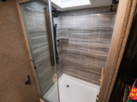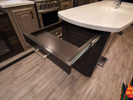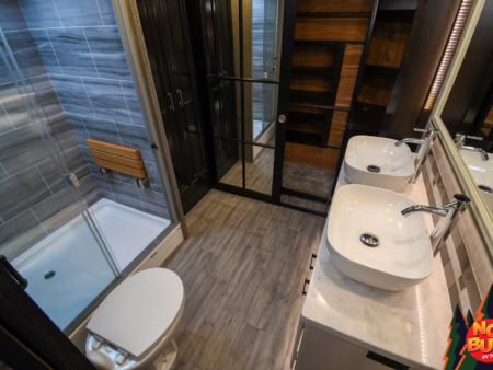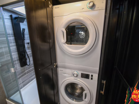 The crickets sing their nighttime serenade as the party dissolves, and all that remains are the tired bodies of Sue and Matthew. Together in the front bathroom they ready themselves for bed, tossing dirty clothes into the washing machine. Matthew steams out the day’s toxins in the large standing shower as Sue performs her skin care routine at the double vanity. Pajamas yanked from the dresser, the pair slink in their slide-out queen bed and drift off to bed, the critters outside scurrying about, lull them to sleep.