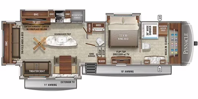 This unit comes with: Ducted A/C, power leveling jacks, fantastic fans, back-up camera, tinted windows, roof ladder, solar panel, aluminum wheels, spare tire, double vanity, central vac, LP detectors, power awning, exterior speakers, and exterior entertainment