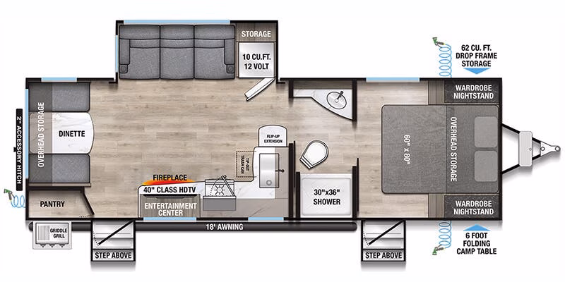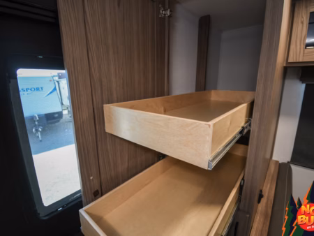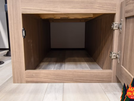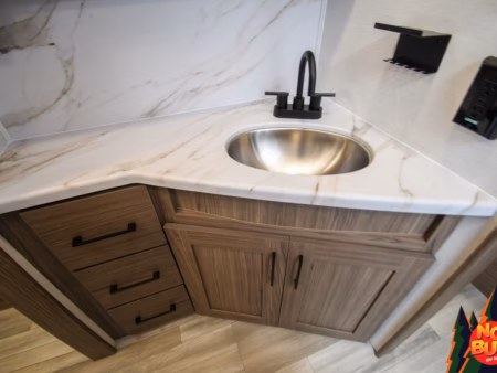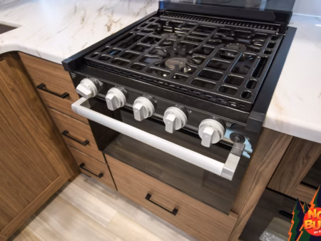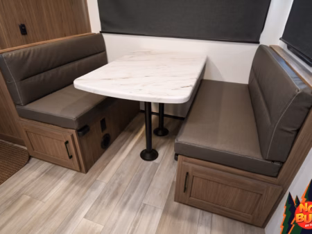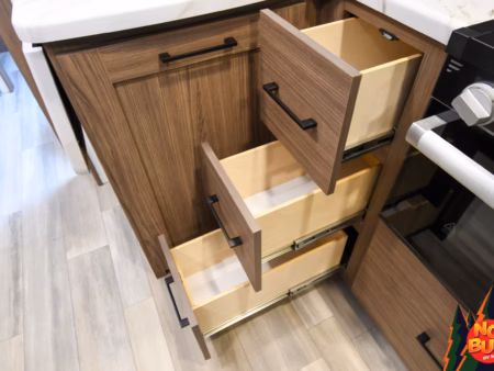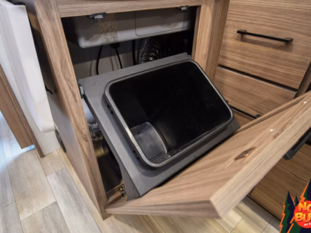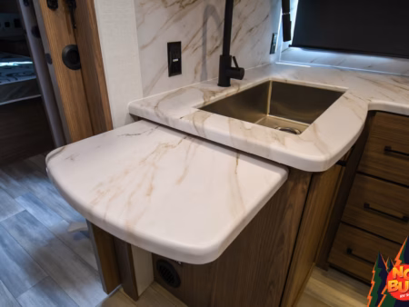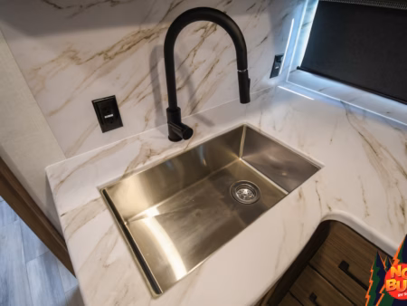 As the rain pelts the roof, they hurry into the kitchen to cook dinner, swinging open the fully stocked fridge and chopping vegetables on the extensible countertops as they fire up the 3-burner stove and oven. The kids set the table at the rear booth dinette and as they finish, throwing their scraps in the drop-down garbage bin, the dishes are done in the farmhouse-style sink.