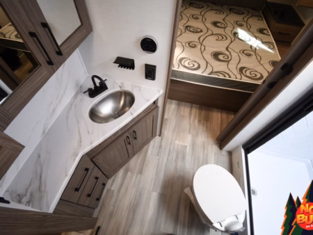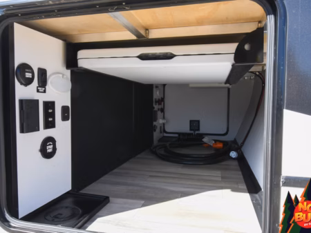 As night falls, you see them crawl into the queen-sized bed up front and doze off to the sweet, serene sounds of nature. If you were in there, you’d set an alarm on your phone that you place beside your head on the nightstand to wake up and watch the sunrise, the secondary door in the bedroom making sure you don’t wake the rest of the trailer. But for now you’re wet and cold, so go back to your campsite and dream more about having the new toy on the block.