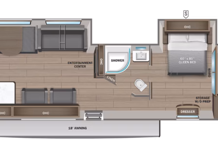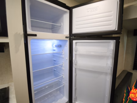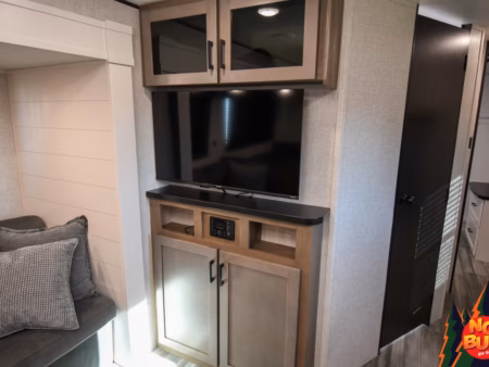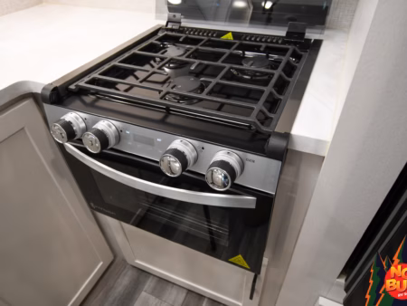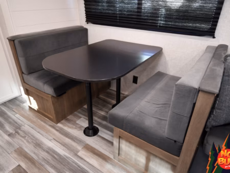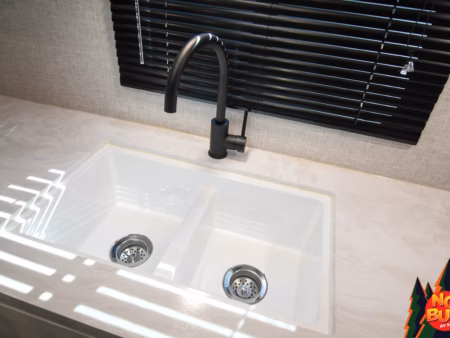 A chef’s dream tucked at the back of the trailer, the rear kitchen beckons to be cooked in. The countertops shine under the soft lighting, offering space for preparing a delicious meal with food stocked in the fridge and pantry. Slicing and dicing meticulously, you throw the veggies and meat into a pan on the 3-burner stove, the sizzling aroma filling the space. After you finish creating a savory dish, you and your partner sit at the booth dinette, enjoying the meal with the windows cracked, the smell of rain mixing well with the dish in front of you. You throw the dishes into the dual sink to clean up later as you head back outside to watch the weather pass you by, a steaming cup of coffee in hand.