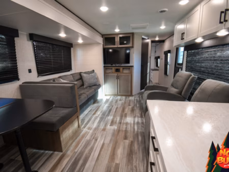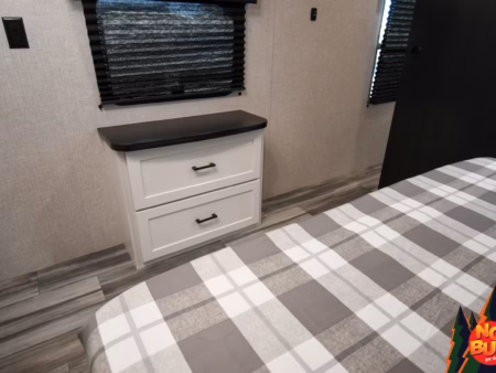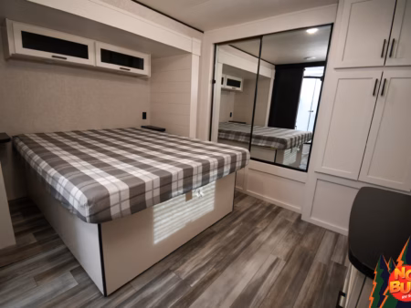 Reaching the rear bedroom after a long day feels like an accomplishment you’re more than ready to accept. You pull your silk pajamas from the dresser at the foot of the slide-out queen bed and slip under the soft covers. The sounds of the forest outside become a lullaby, and you and your partner settle in for the night, knowing that tomorrow holds more adventures.