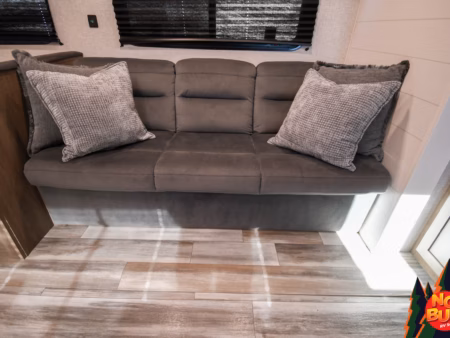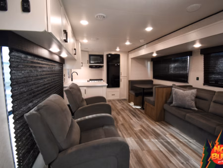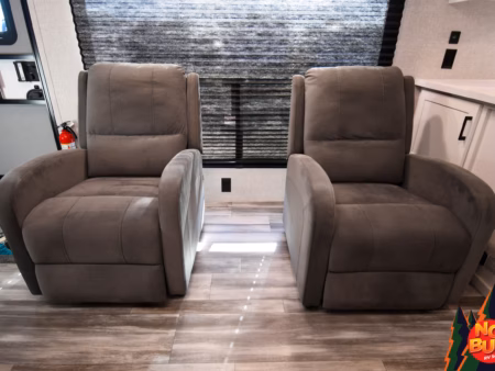 It’s late, but you’re not quite tired, so you settle into the living area. The jack-knife sofa-bed offers the perfect spot to unwind, whether you’re watching a favorite movie on the flat-screen TV or simply enjoying the peace of the moment. For a more quiet retreat, the recliners provide a cozy nook for reading a book, the soft lighting casting a warm glow as you get lost in a story.