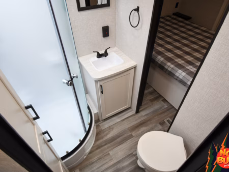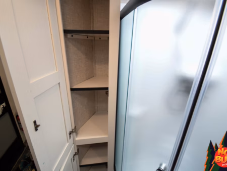 You can’t help but yawn, so you head to the spacious bathroom to wash up for the night. The standing shower—with on-demand hot water—provides enough room to refresh, while the full vanity gives you the space you need to get ready for the evening. The deep linen closet stores all your towels and necessities, and the foot-flush toilet adds a touch of convenience to your routine. You feel completely rejuvenated as you step out, ready for the final part of the day.