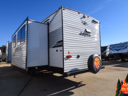 As you pull into your campsite, the sleek exterior of the 2025 Jay Flight SLX 290RKS travel trailer gleams under the golden sun. The awning extends over the outdoor living space, covering your folding chairs from the elements—there’s rain in the forecast, just a drizzle though. A large pass-through storage keeps the rest of your gear neatly tucked away. But now you’re getting hungry and the clouds are rolling in.