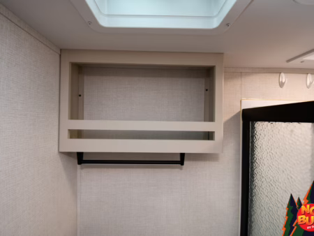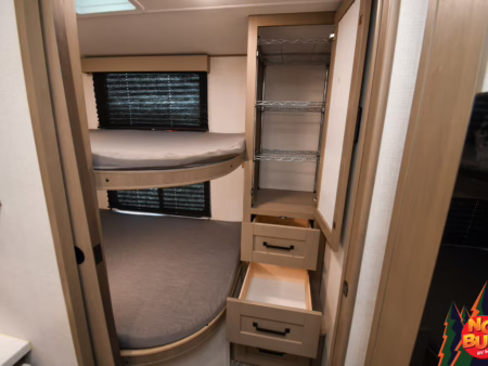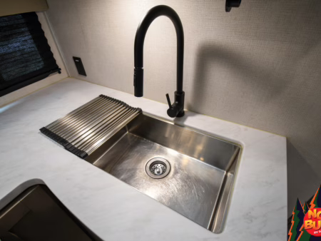 The 370W solar panel powers on the even flow heating system, keeping the kids’ toes toasty and warm as they run back and forth in the open floorplan, climbing up to the rear bunks and leaping off—something they’re not allowed to do at home, by Mom and Dad can’t say no to those smiling faces now. Marie freshens up in the front bathroom, the sliding-glass door to the standing shower steaming before scurrying to the bedroom, contemplating crashing on the queen bed as she yanks pajamas from the wardrobe (it’s never too early for pajamas).