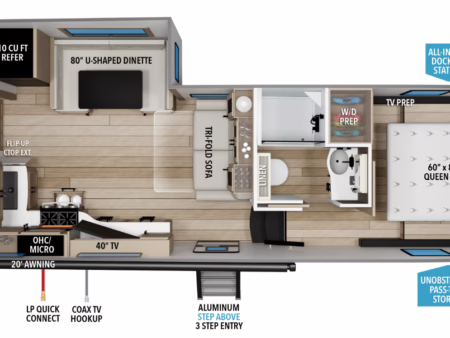This unit comes with: Ducted A/C, electric auto jacks, roof ladder, solar panel, queen bed, bunks, aluminum wheels, spare tire, solid steps, new tires, Duchess even flow heating system LP detectors, power awning, exterior speakers, and exterior shower